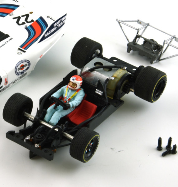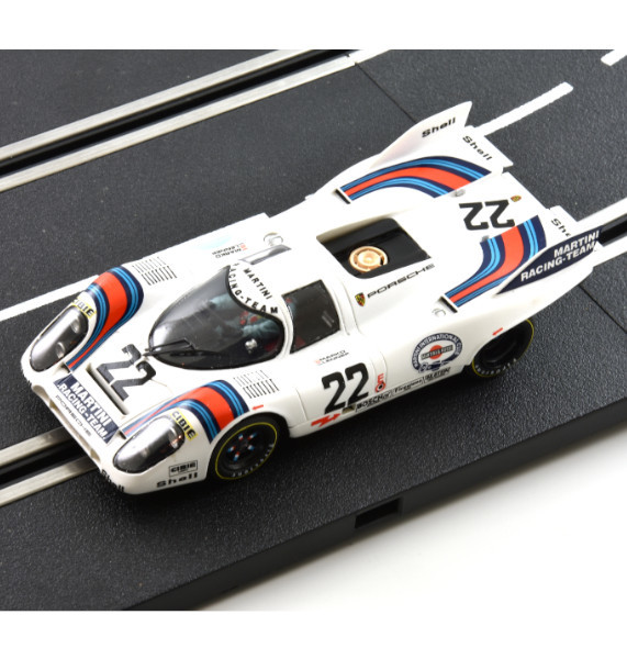 1/32 reproduction in a racing slot version (equipped with a 12V engine to drive on a circuit) of the Porsche 917K no. 22 which won the 24 Hours of Le Mans in 1971.