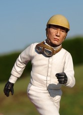 Figurine d'un pilote des années 50 reconnaissable à son casque bol typique de ces années-là. Il est en position de prendre le départ à la fameuse course des 24 Heures du Mans et court vers sa voiture. Il porte ses lunettes autour du cou qu'il mettra sur son nez dès qu'il sera dans son véhicule. Ce type de départ s'est arrêté au début des années 1970.