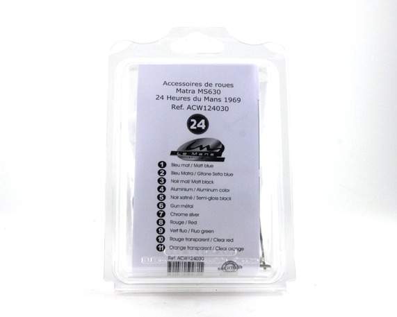 Jeu de 4 roues complètes à assembler pour un véhicule type Matra de 1969. Les pneus sont en résine souple.
